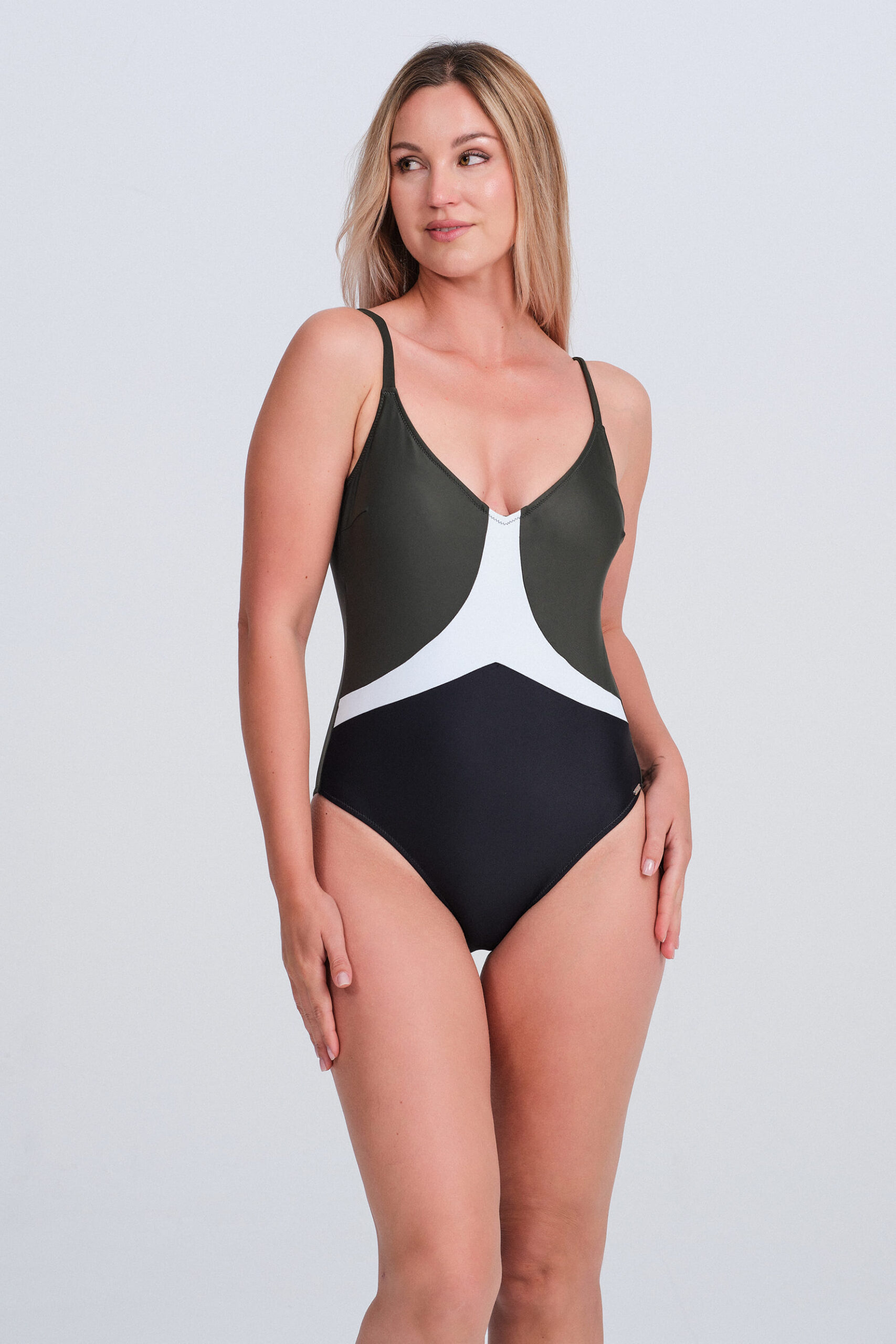 Este bañador de una pieza destaca por su diseño de bloques de color trío que estiliza visualmente la silueta. La combinación de verde oliva profundo en el torso, una franja central en blanco roto y negro clásico en la parte inferior crea un contraste moderno y muy elegante.