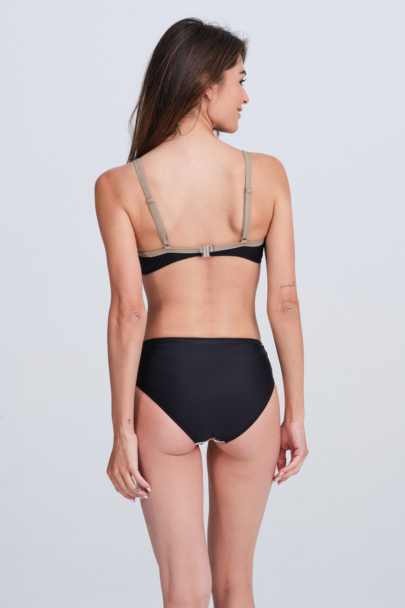 Parte de arriba con aro y capacidad,sin relleno y tirantes regulables. Braguita a juego, de corte clásico