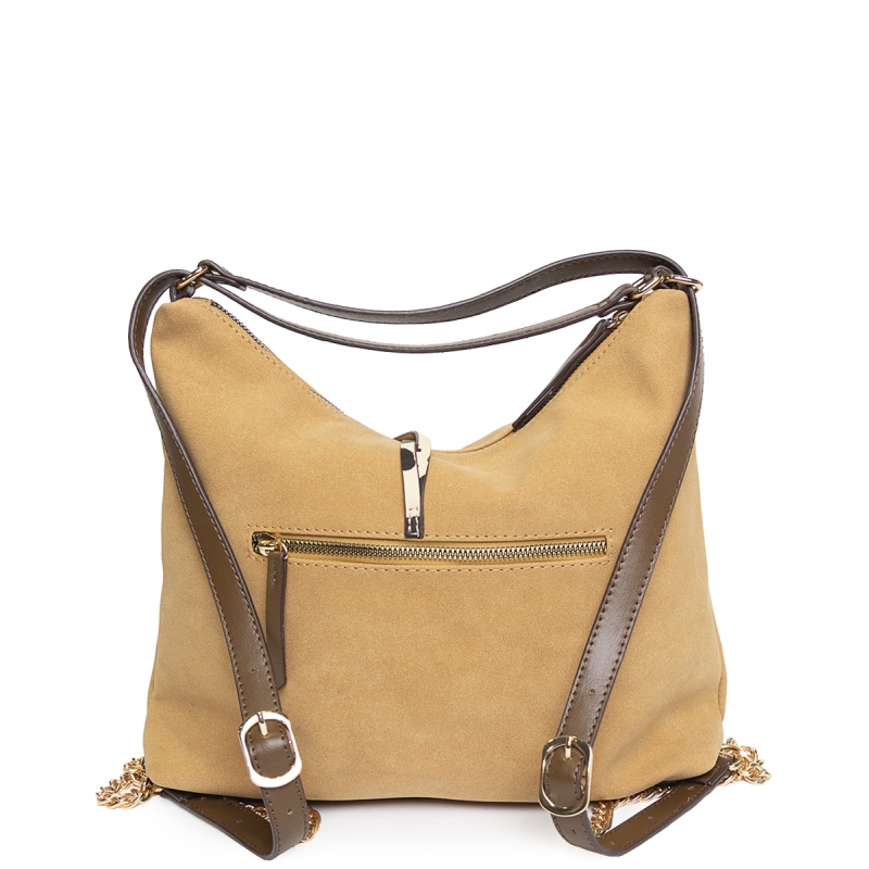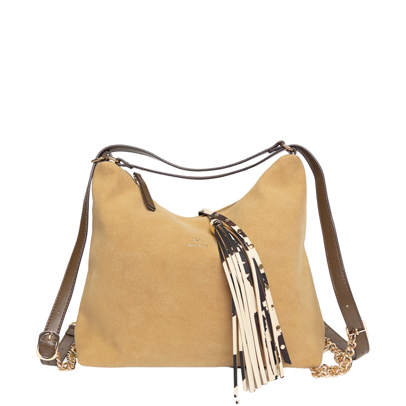 Bolso y mochila dos posiciones en antelina, con centro de larga borla y tachas en estampado de vaca, asas en material sintético y cadena