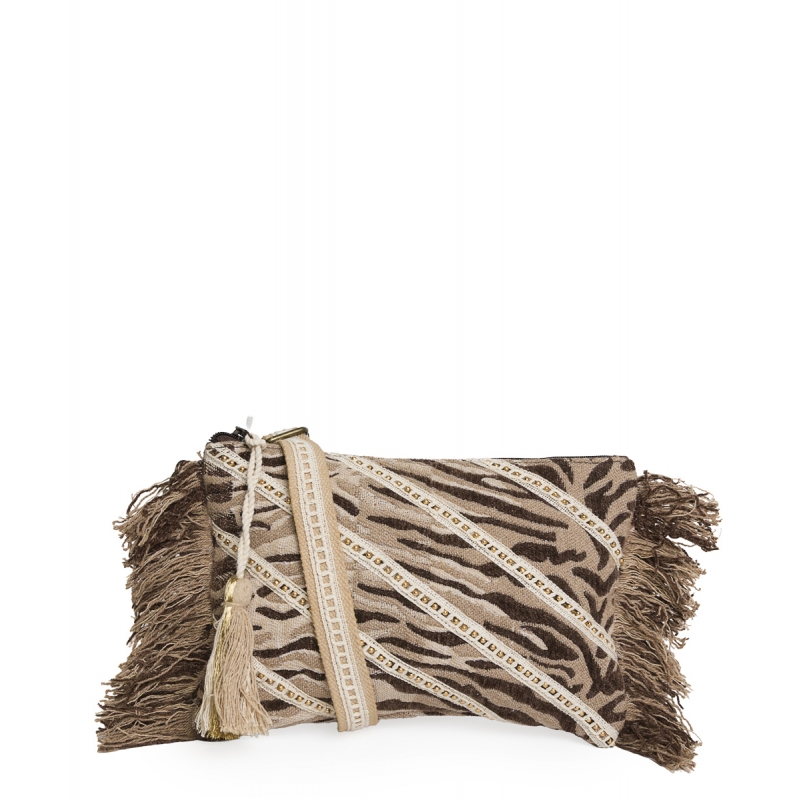 Bolso clutch de algodón estampado animal, con cintas en diagonal y bolitas doradas, asa larga regulable y asa corta de algodón, ambas desmontables y flecos a los lado en color beige marrón