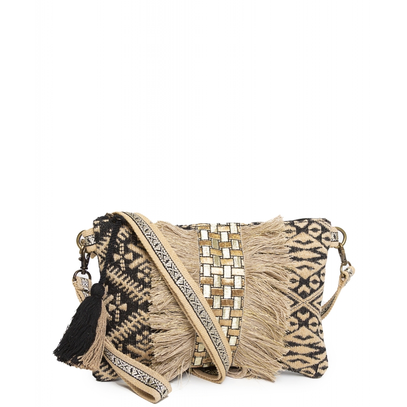 Bolso de algodón en estampado geométrico, con centro efecto trenzado en dorado con flecos, asa larga regulable y asa corta en algodón, ambas desmontables