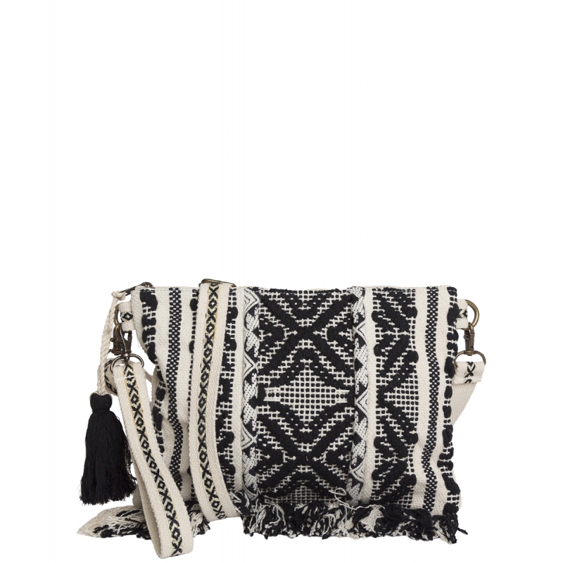 Bolso de algodón en estampado geométrico, flecos en borde de abajo, asa larga regulable y asa corta de algodón, ambas desmontables