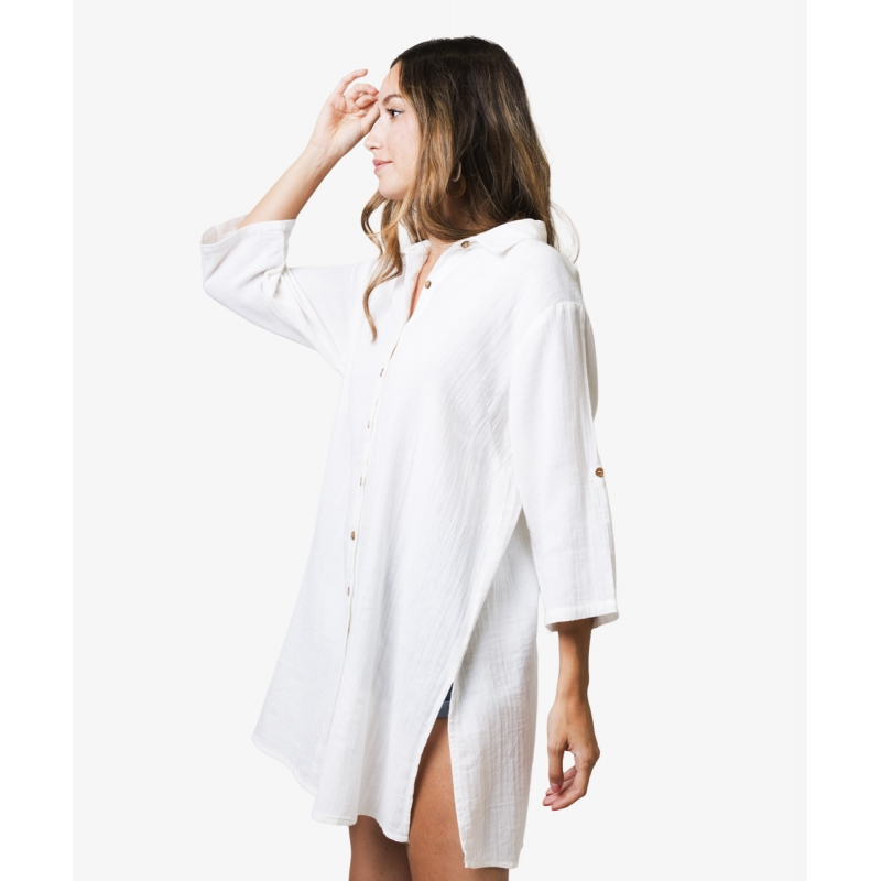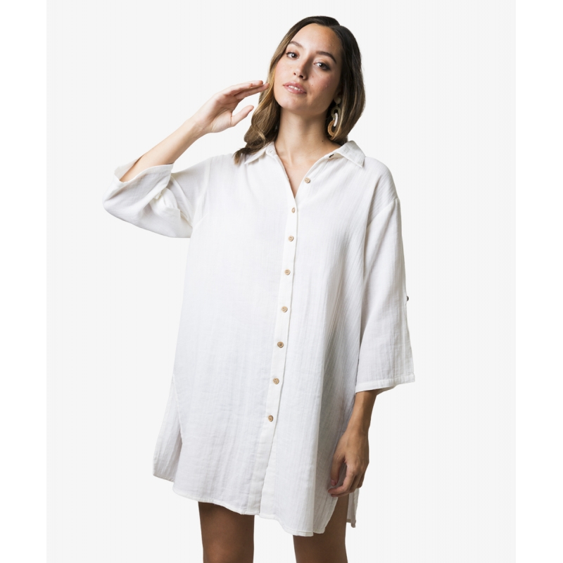 Camisa larga en tejido «doble gasa» de algodón natural. Con cuello camisero, manga francesa ajustable con tira, tapeta con botones de coco, con bajo recto y aberturas laterales.