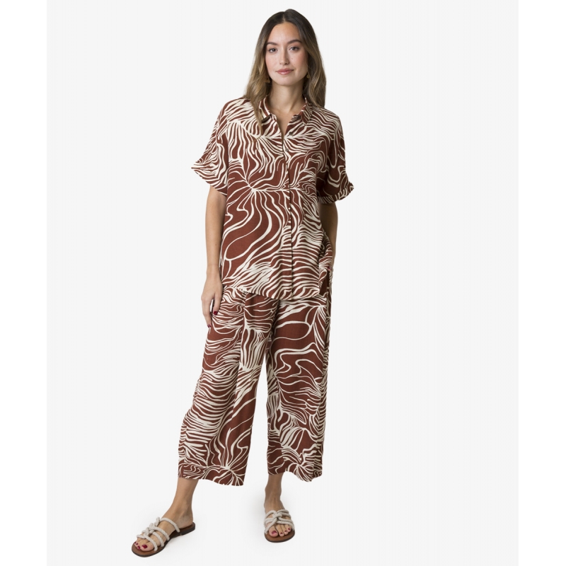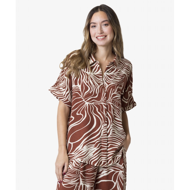 Camisa en tejido fluido de viscosa con cuello camisero y manga corta con vuelta en la bocamanga y tapeta de botones escondida, en estampado