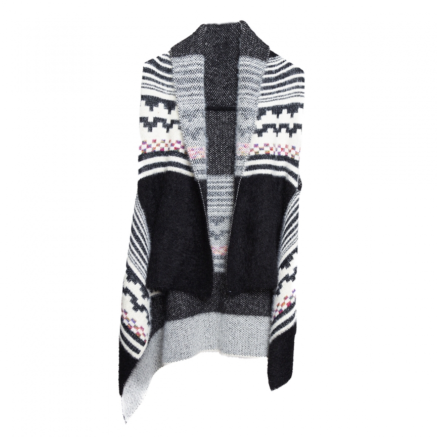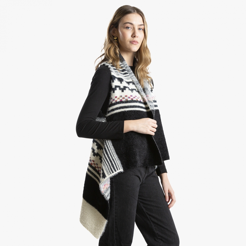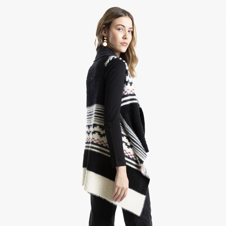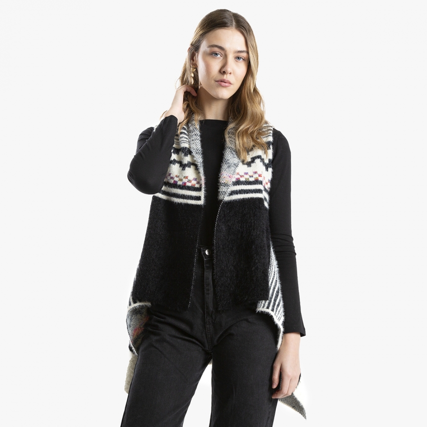 Chaleco de suave tejido tipo angora con mix de colores lisos y dibujos étnicos