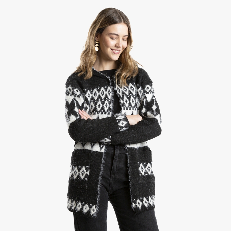 Chaqueta en material extra suave tipo angora con bolsillo frontal y capucha. Detalles en rombo