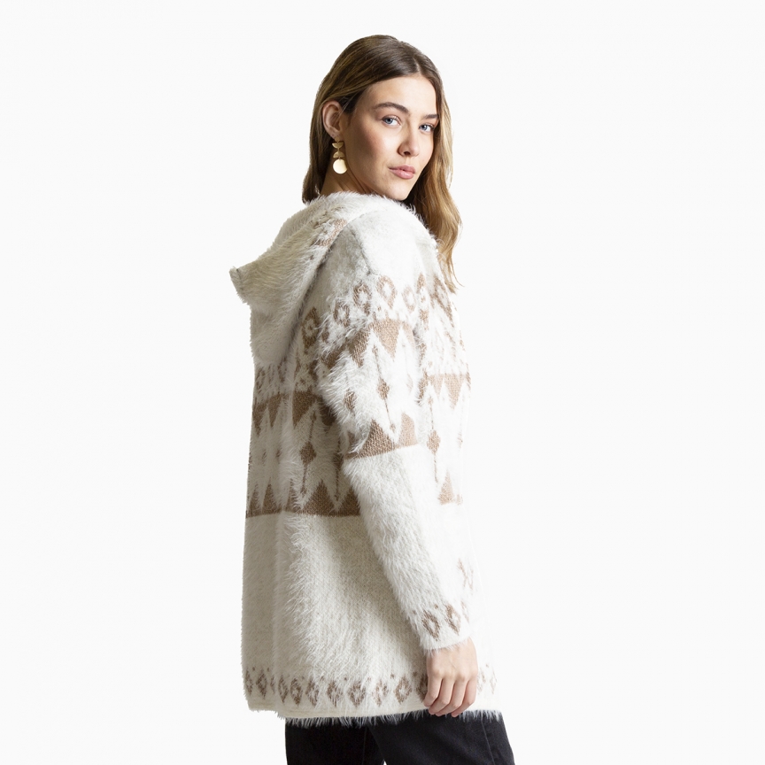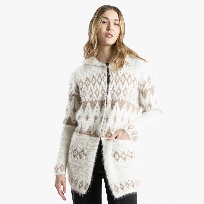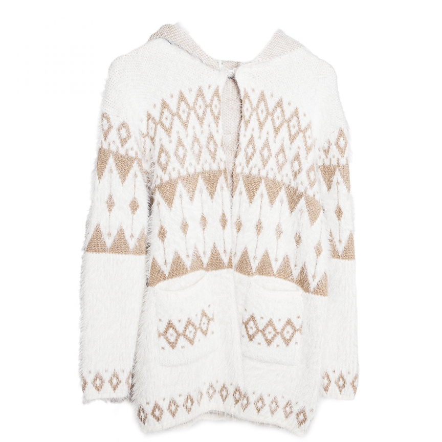 Chaqueta en material extra suave tipo angora, bolsillo frontal y capucha con motivos en rombo