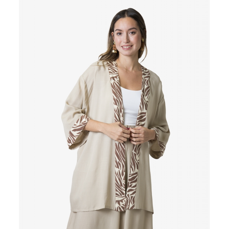Chaqueta tipo kimono, manga campana y con bolsillos laterales, detalle de cinta en motivo «Brown Animal» de algodón en vista y puños