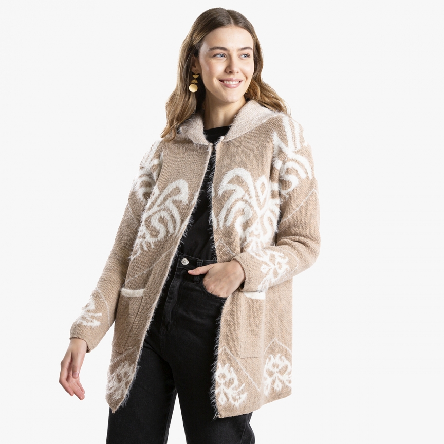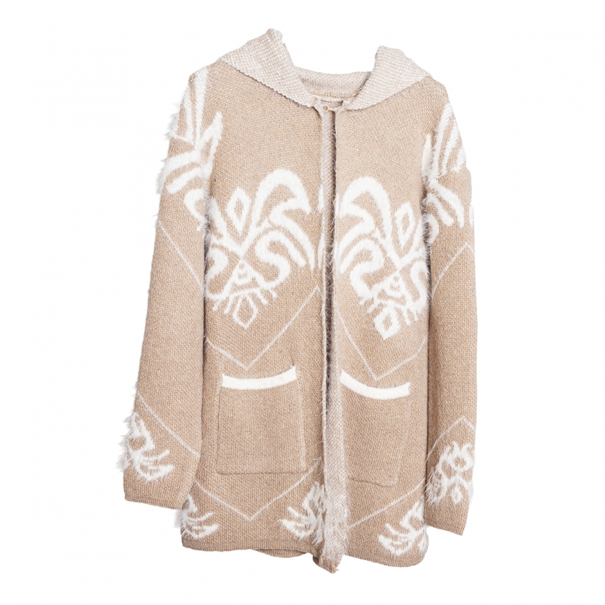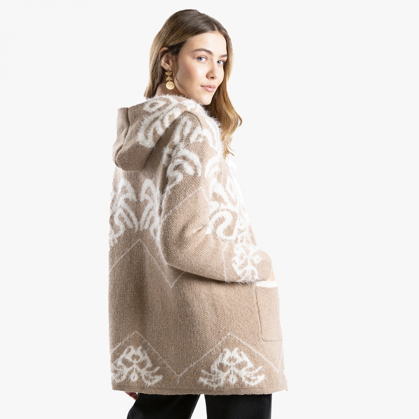 Chaqueta en material extra suave tipo angora, bolsillo frontal y capucha con motivos arabescos