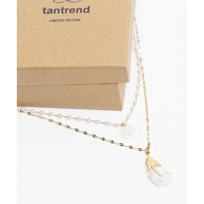 Colgante doble vuelta de cadenas soldadas en perla y mini piezas ovales, con nácar de flor y pluma,en acero inoxidable con baño de oro 14 quilates de 4 micras.