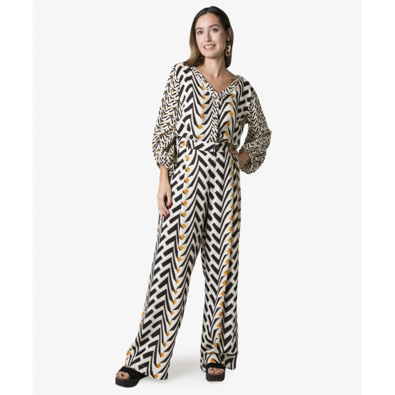 Pantalón de corte recto, con pliegues y bolsillos delanteros, cintura ajustable con elástico en los costados, presillas y botón de coco, en estampado geométrico
