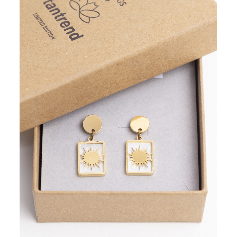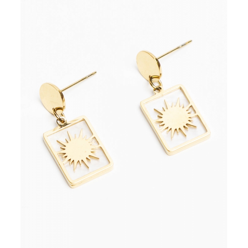 Pendiente con post redondo y colgante rectangular en nácar con motivo central, en acero inoxidable de oro de 14 quilates de 4 micras