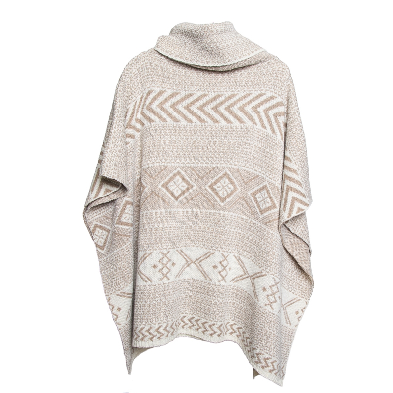 Poncho en suave material tejido con cuello volcado y motivos geométricos tipo nórdicos, en color beige