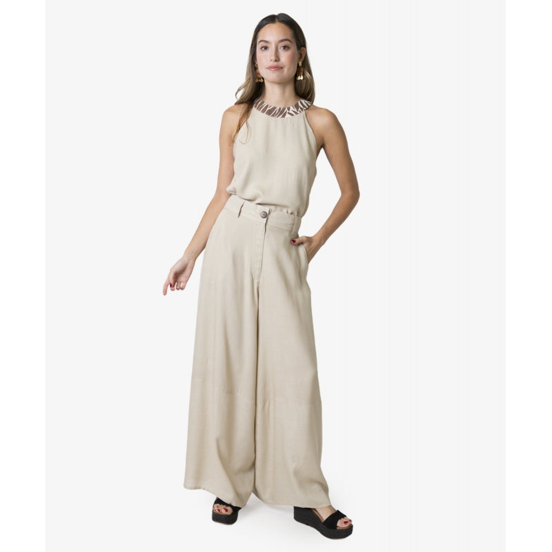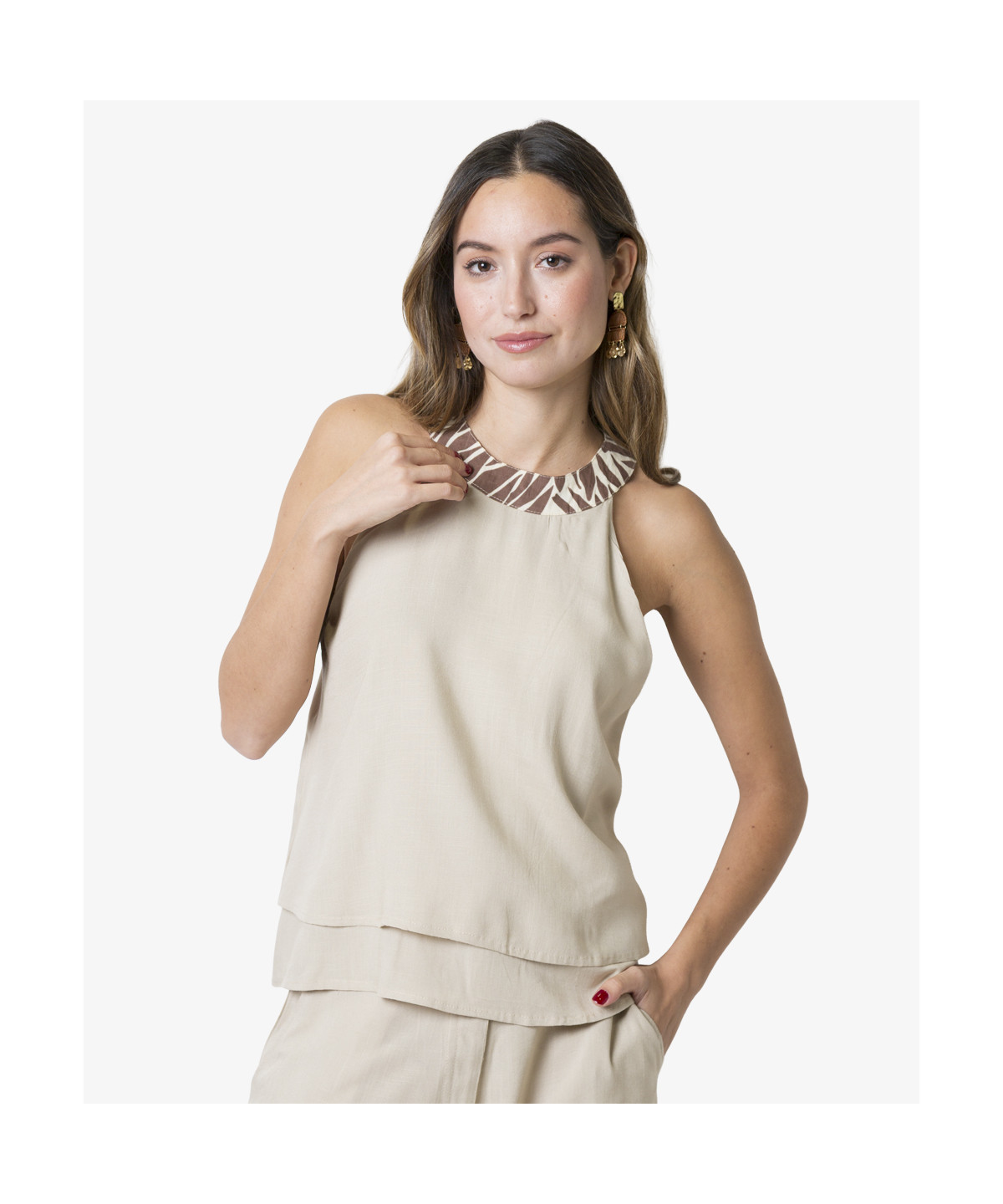 Top escote tipo «halter» con dos capas en beige natural, y estampado en cuello, abertura en espalda con botones de coco