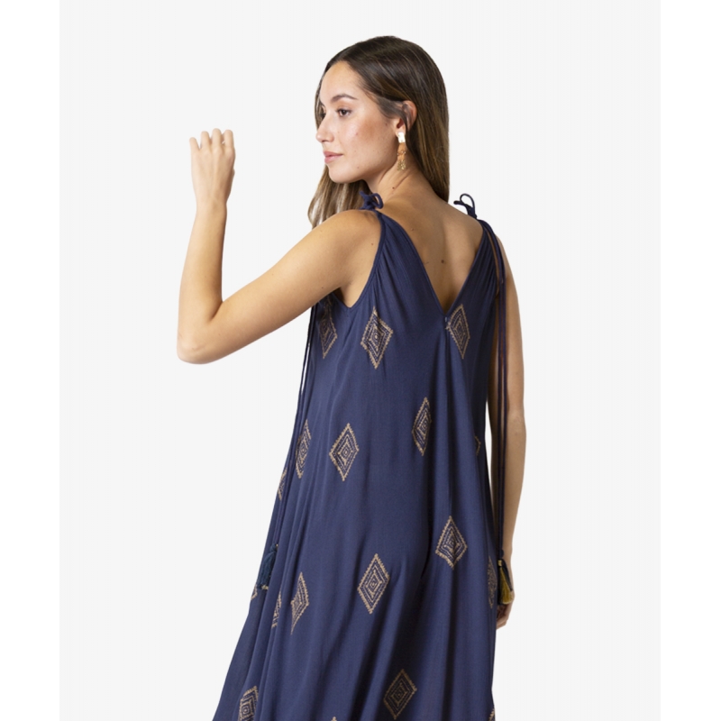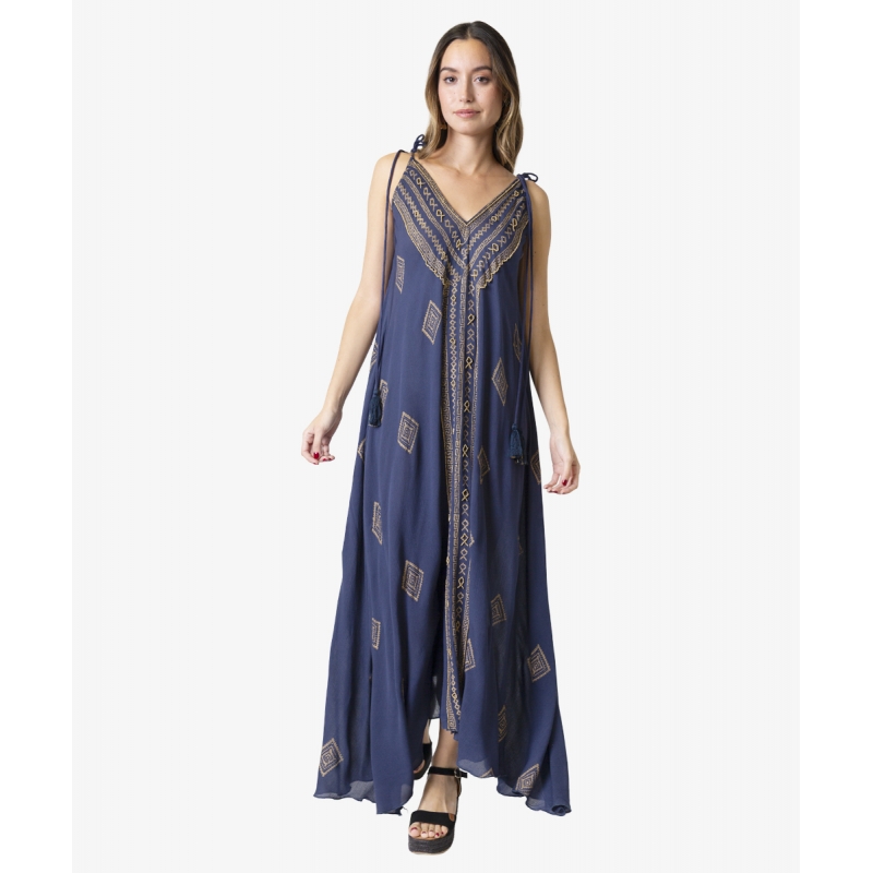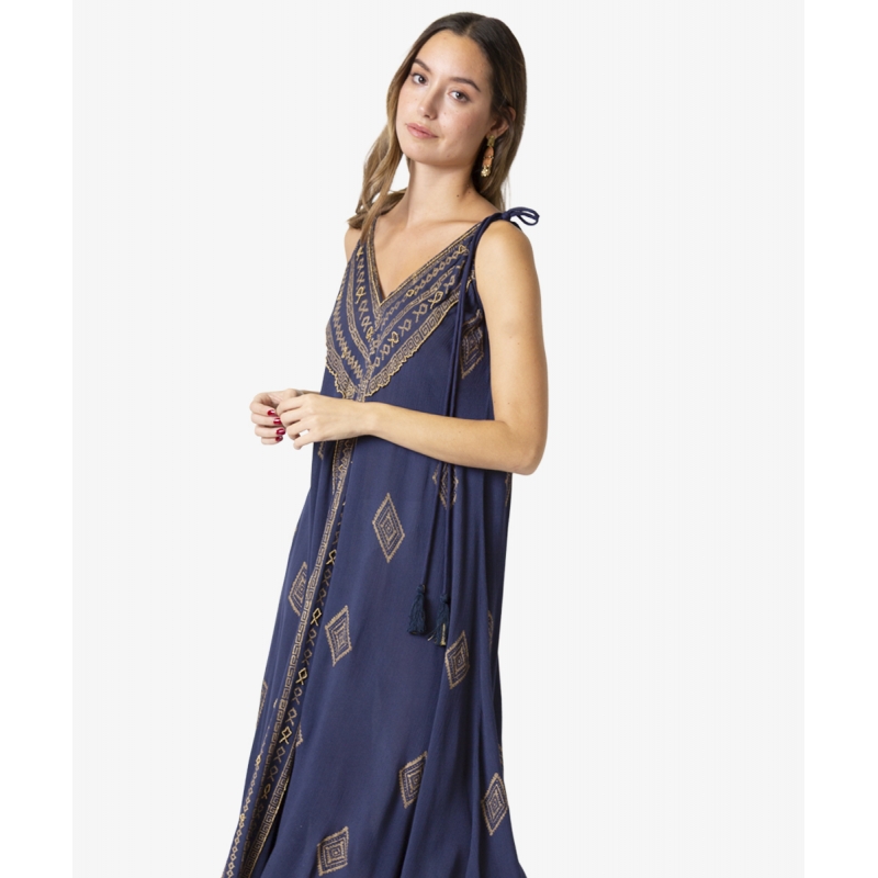 Vestido largo de corte circular en tejido fluido de viscosa efecto bambula, en azul marino con estampados realizados a mano en «foil» dorado, motivos geométricos.Bordado a mano de cuentas doradas en el escote y franja central. Con tirantes ajustables al hombro con cordón de tejido y borlas, en un color