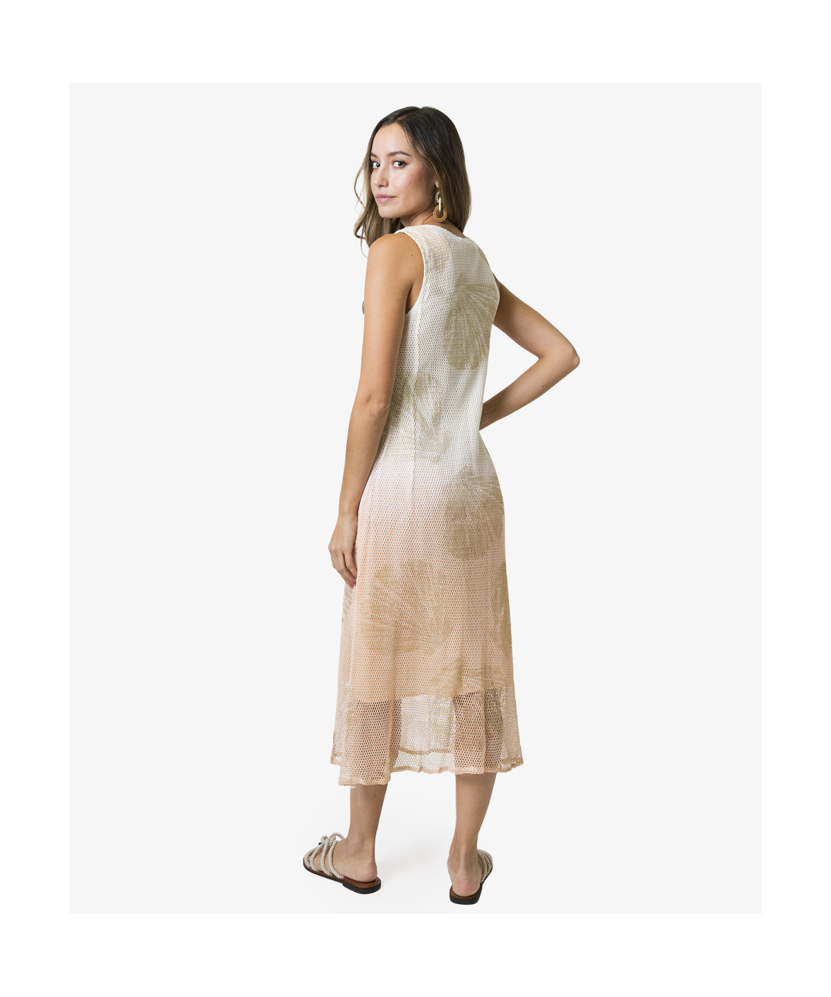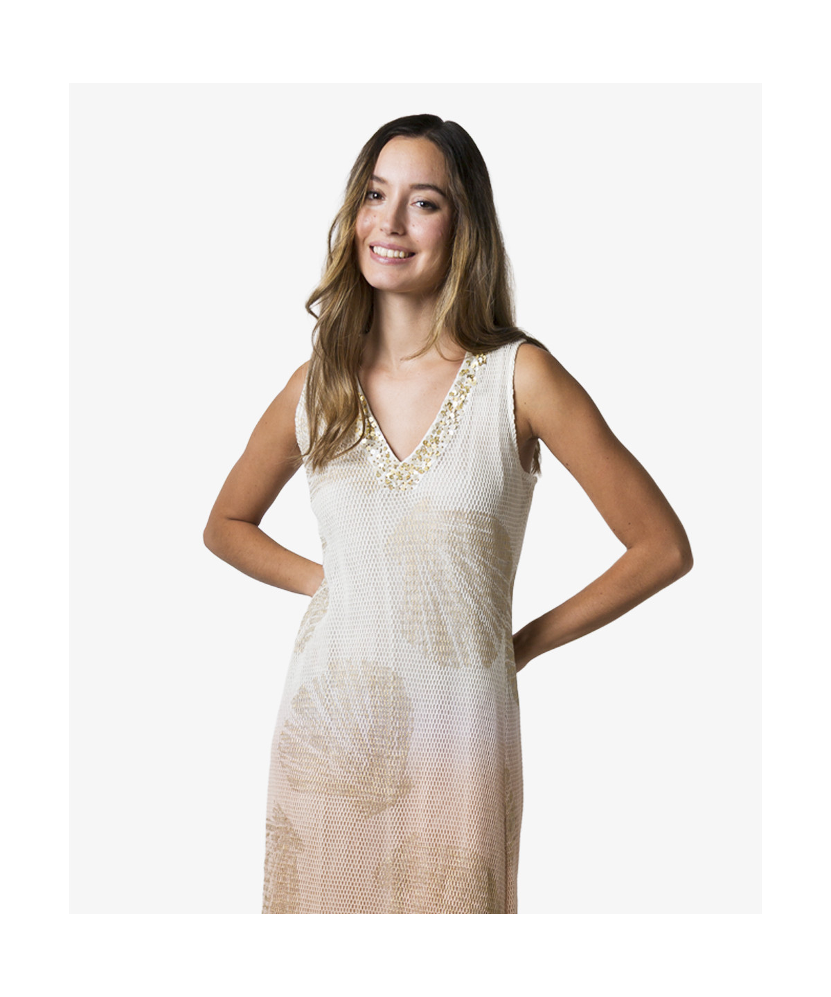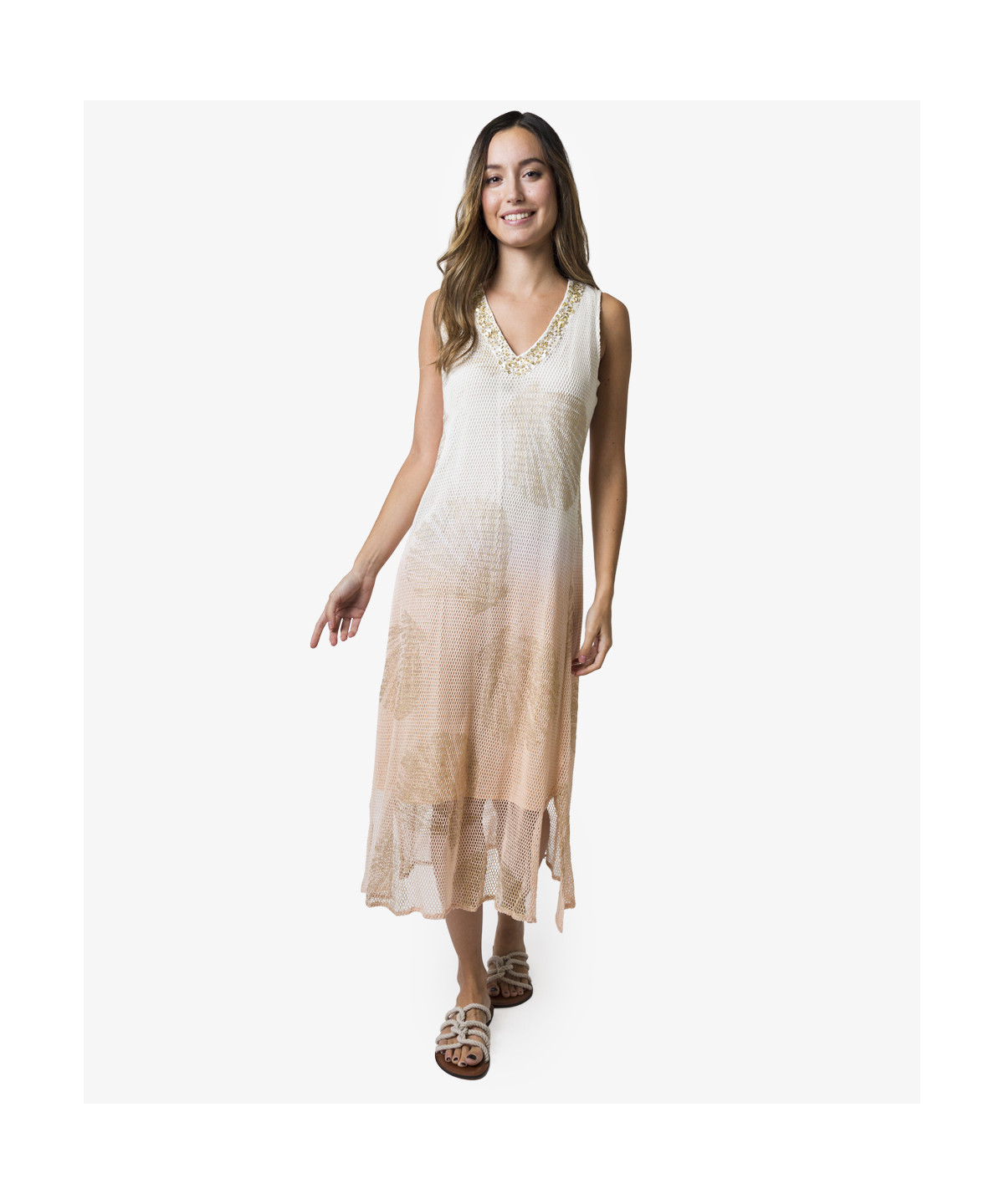 Vestido midi en tejido de red de algodón natural, teñido en color degradado en rosa empolvado, con estampado de conchas en «foil» dorado, escote en pico con bordado de lentejuelas doradas y nacaradas. Con aberturas laterales y forro
