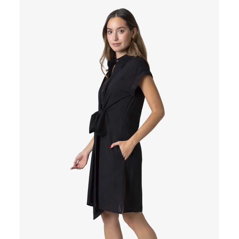 Vestido tipo camisero, con detalle de lazo en cintura, bolsillos laterales y tapeta con botones de coco