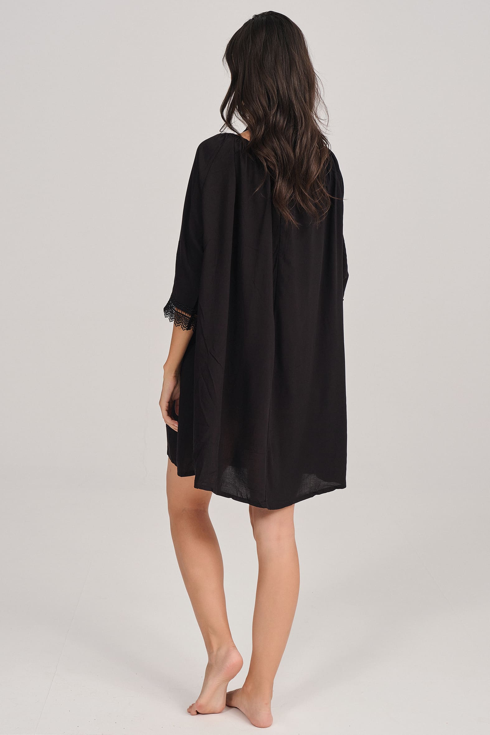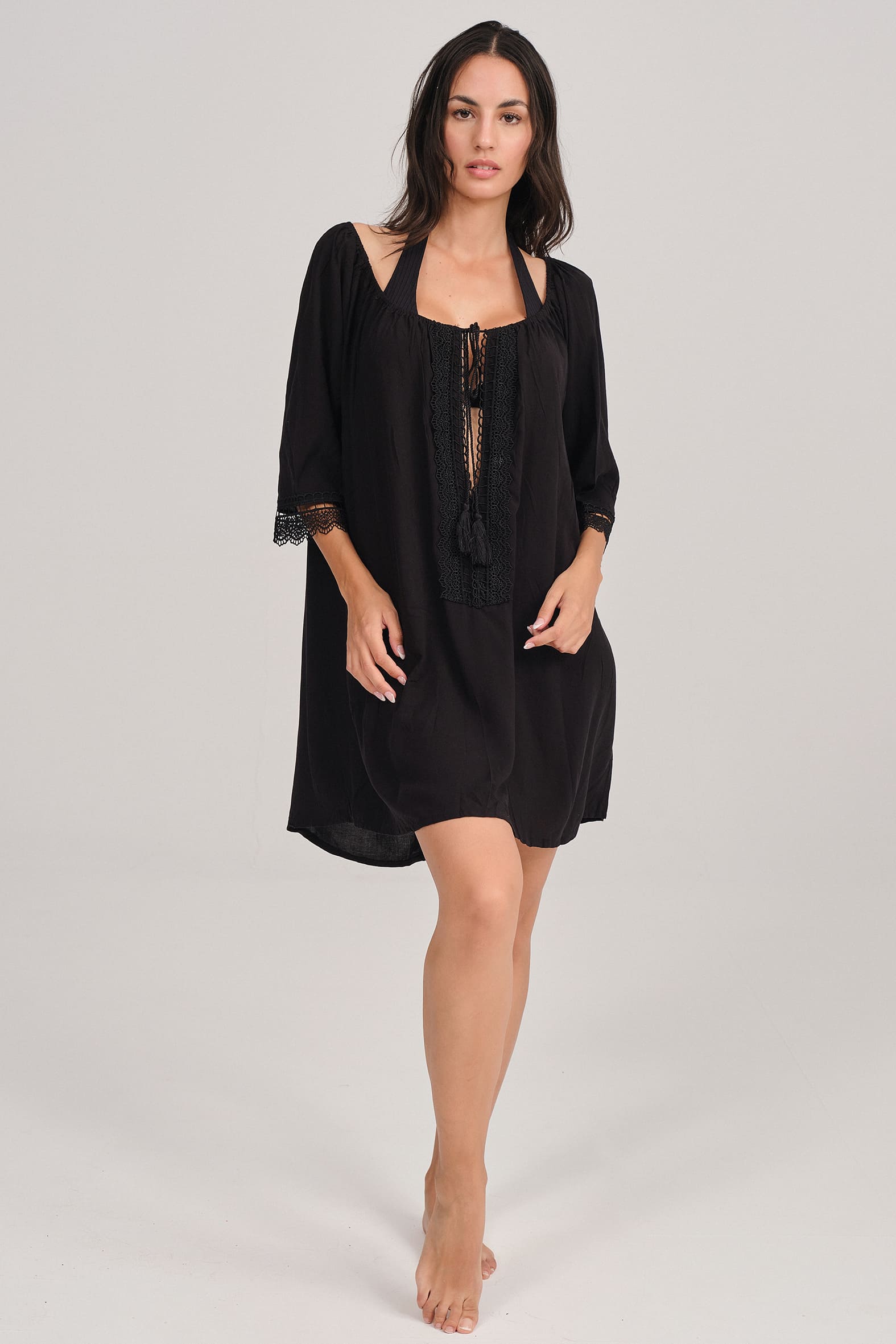 Añade un toque de elegancia a tus días de sol con este vestido corto en color negro. Su diseño destaca por un espectacular pechero con bordados calados y borlas decorativas que le dan un aire bohemio y chic. Las mangas de largo medio terminan en un delicado remate de encaje, mientras que su tejido fluido garantiza frescura y comodidad absoluta sobre tu traje de baño.