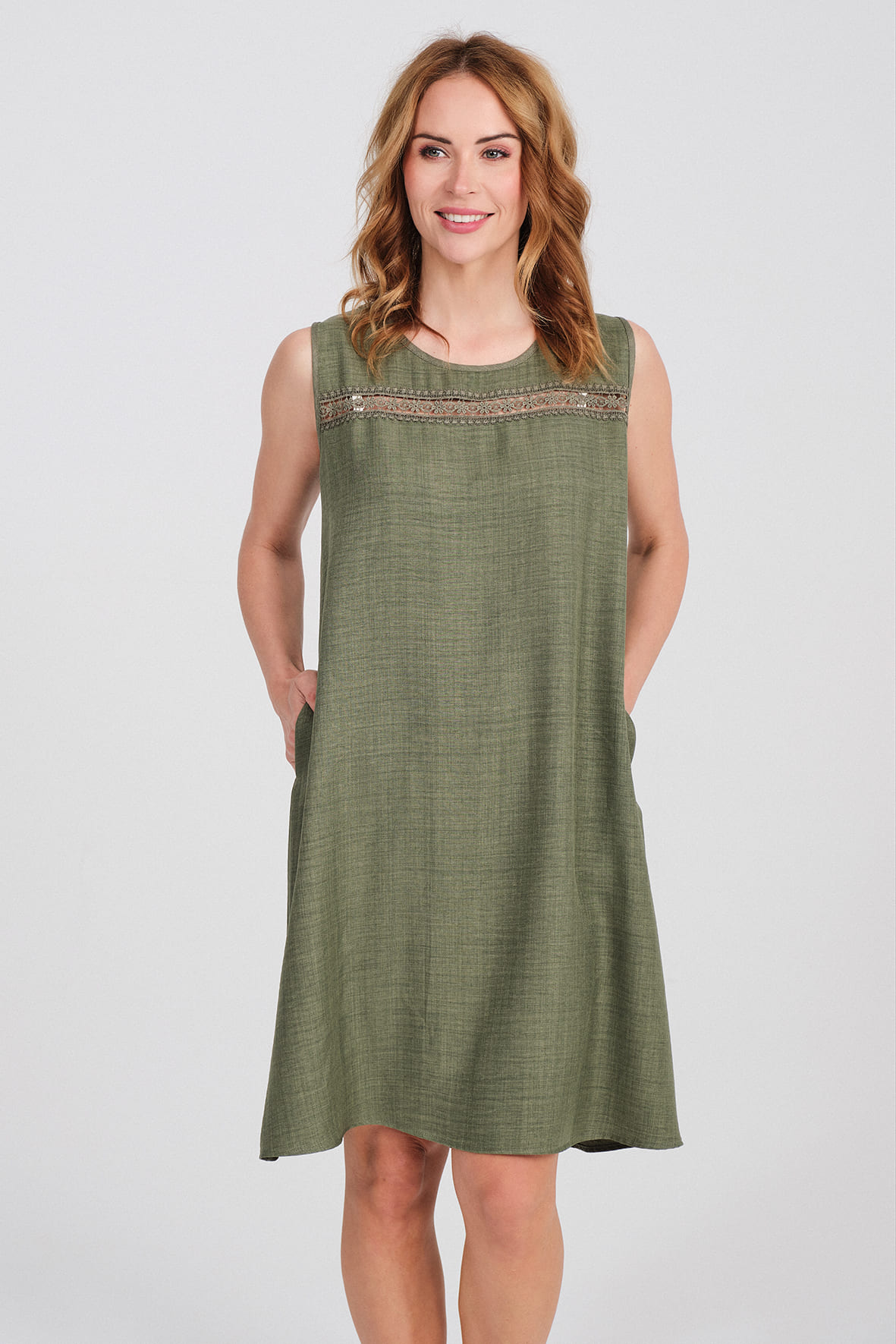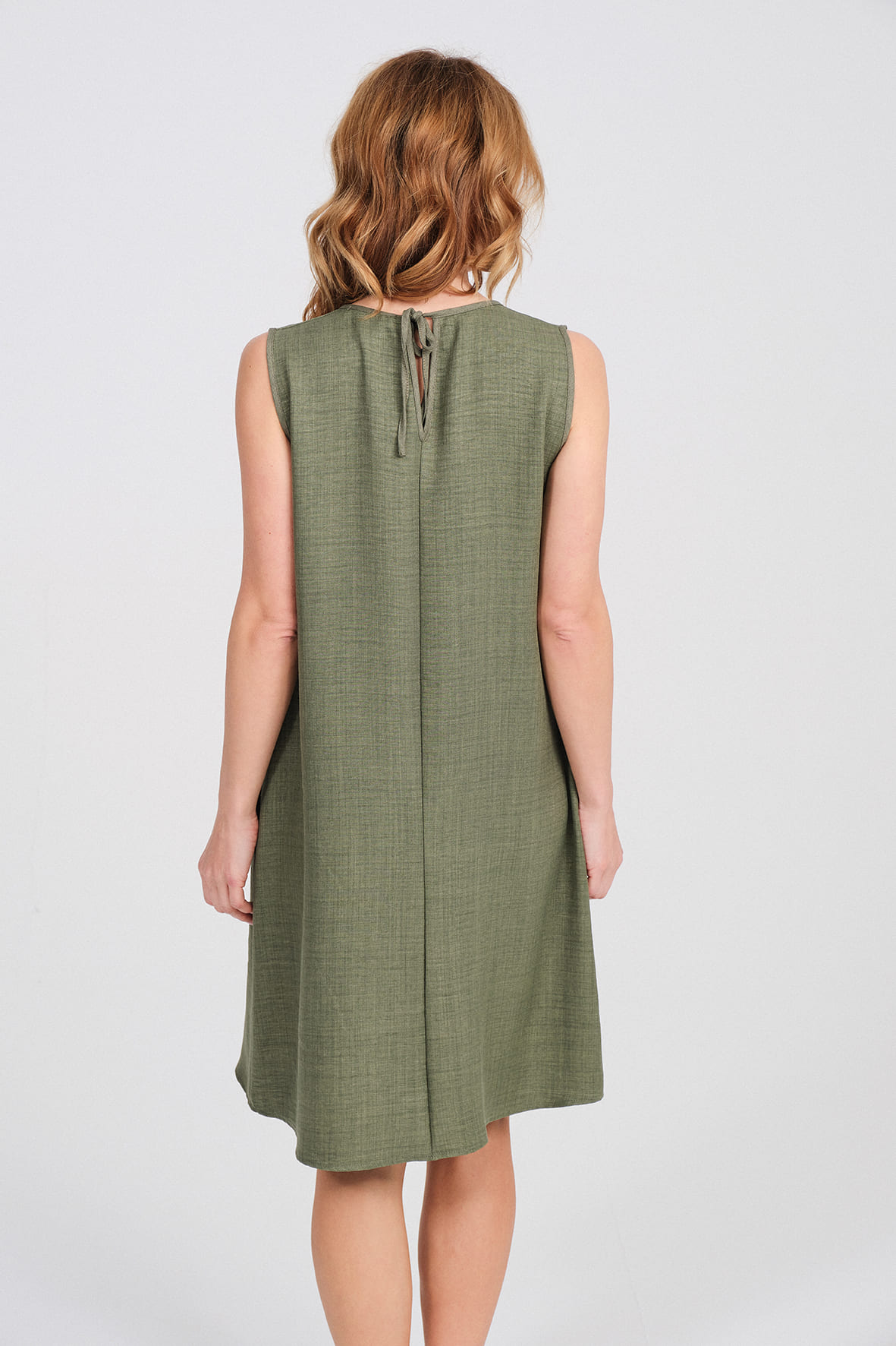 Descubre la libertad de movimiento con nuestro vestido de corte evasé en color verde oliva. Confeccionado en un tejido que imita la frescura del lino, esta prenda es la definición de comodidad elegante para los días de calor.