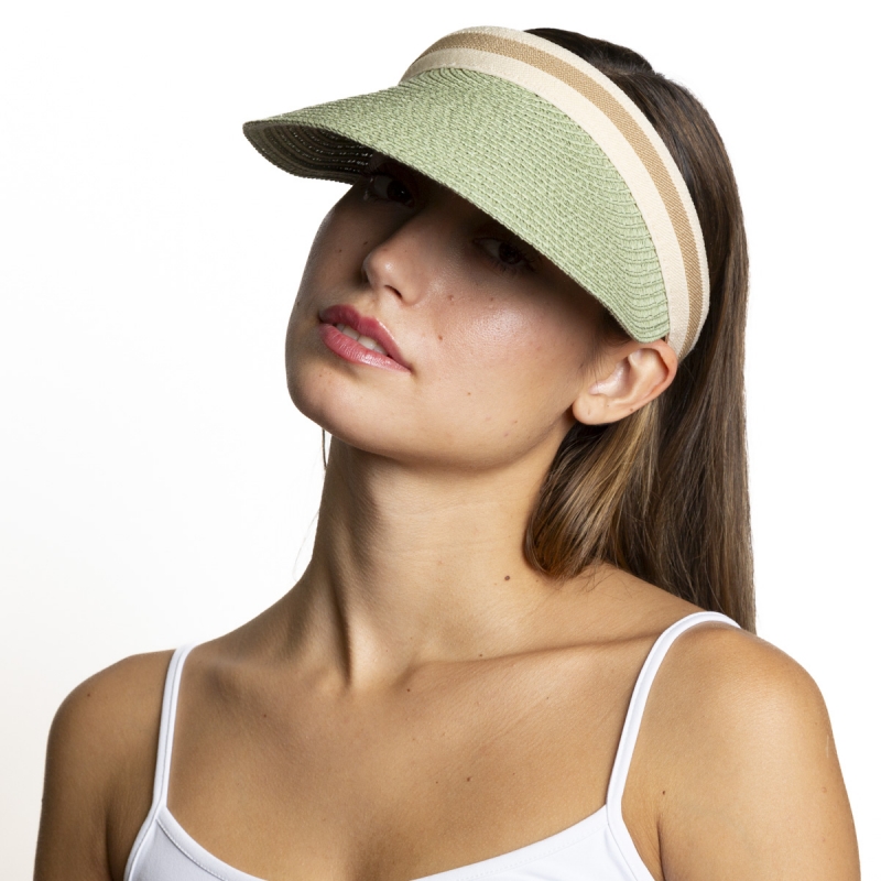 Visera ajustable en material tipo rafia con cinta bicolor ajustable.